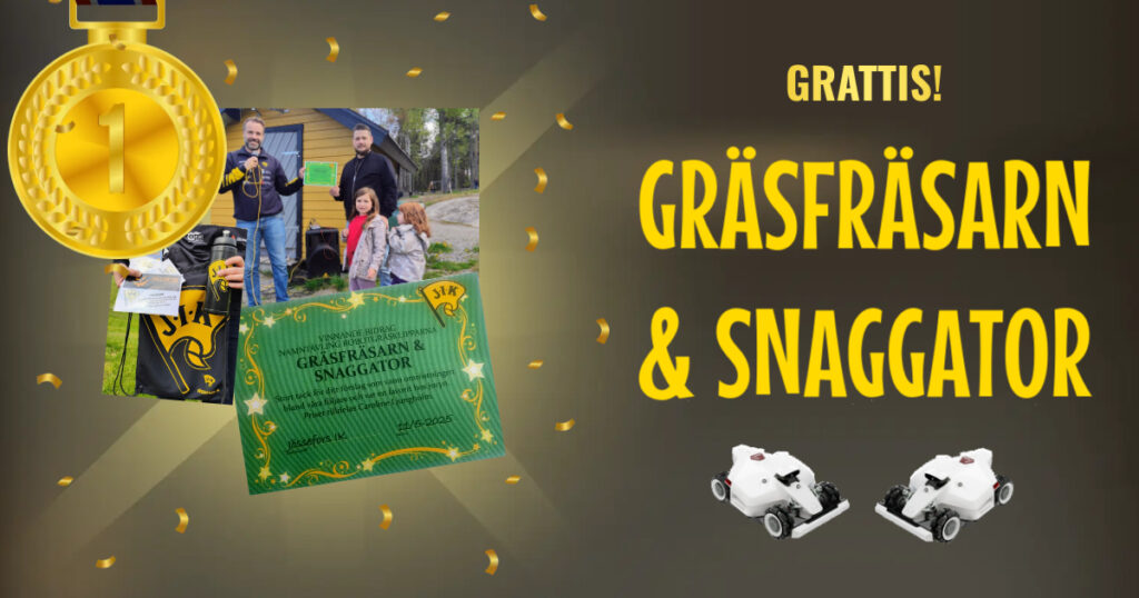 Kampen var jämn mellan Greta Gräs & Ernst och Gräsfräsarn & Snaggator, där tillslut det senare förslaget tog hem vinsten med 3% övervikt av rösterna. Vinnaren utropades under halvtid i herrarnas hemmapremiär på Forshälla. Caroline hade skickat sambo och barn att ta emot vinsten som var vår splitternya JIK gympåse och vattenflaska, presentkort på 100:- i kiosken, Halloween biljett, inträden till herrmatcher samt Sverigelotter. De andra bidragen som fanns med i omröstningen har ett tröstpris att hämta på Forshälla. Alla vinnare är kontaktade.